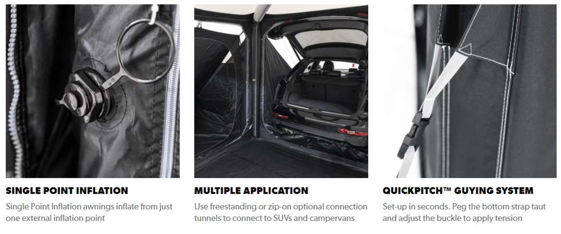 Use freestanding, via the quickpitch guying system or zip-on optional connection tunnels to connect to SUVs and campervans