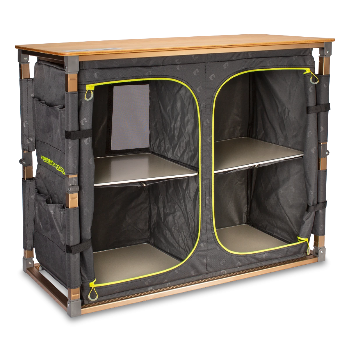 The Eco Fold Twin V2 features a naturally weatherproof and heat-resistant bamboo tabletop and rustproof aluminium frame. A perfect working surface to cook and prepare camp meals. The twin lower cupboards, along with side storage pockets, help to help keep your campsite organized. A retractable utility rack keeps utensils close at hand and can also store a basin for wash-up.