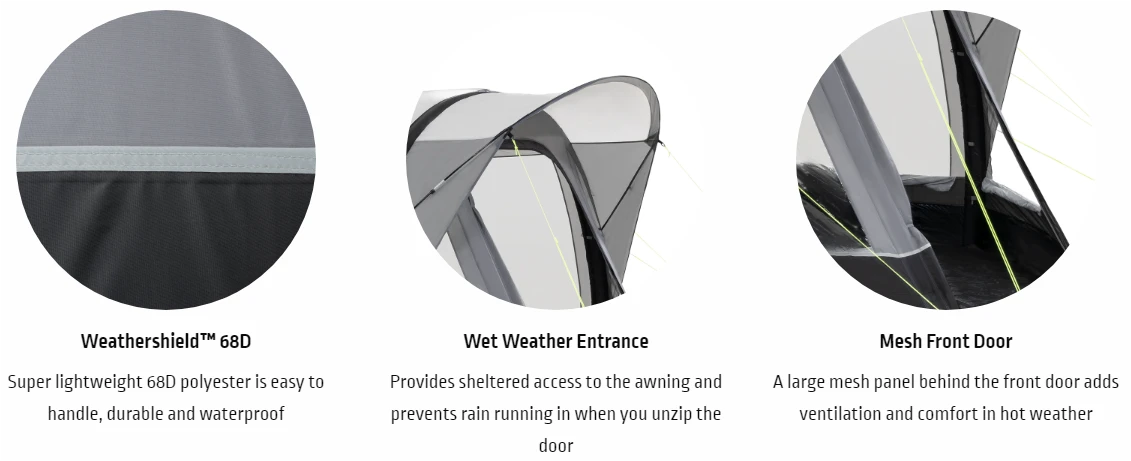 TABLE & STORAGE FEATURES Aluminium edged laminated MDF shelves Carry bag included Easy clean surface Flat pack construction Gas bottle shelf Glow zip pullers Rust proof aluminium frame Storage pockets Twin Cupboard Twin food prep surfaces Twin internal shelves Waterproof table top Zip closed doors